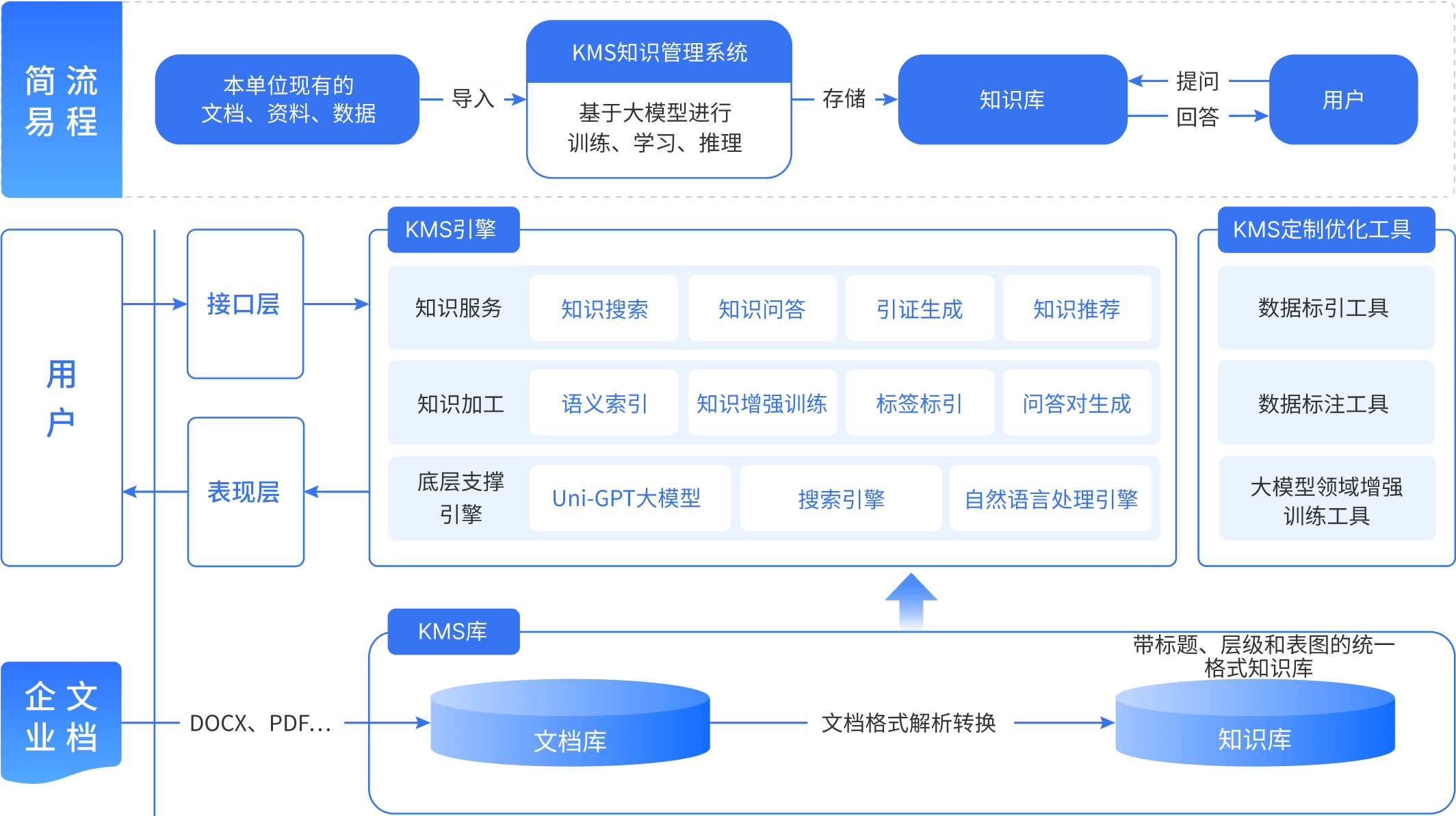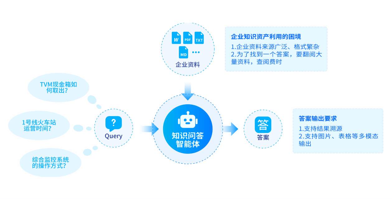 依托大模型构建全面的企业知识库,专注于企业规章制度、政策文件、工作流程及项目管理等内外部资料的精准智能问策服务。系统支持多轮对话交互,实现信息溯源与深度学习,功能覆盖知识问答、垂直搜索及文本自动化生成,为用户提供专业、高效且个性化的知识处理与决策辅助。
