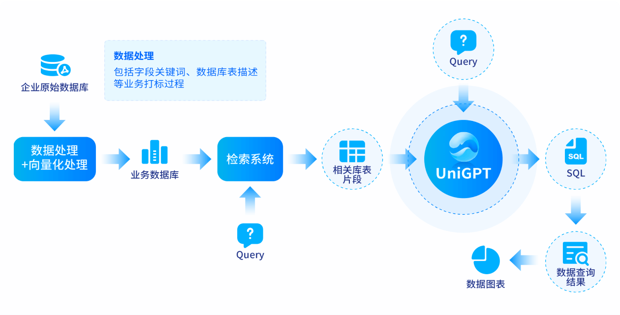 基于大模型的智能问数功能通过深度学习和自然语言处理技术,允许无技术背景的用户以自然语言形式提出数据查询需求,大模型能够智能解析用户意图,并转化为准确的SQL语句以执行数据库查询,自动生成并展示各类型的BI报表,为用户提供高效、便捷的数据分析和查询体验。